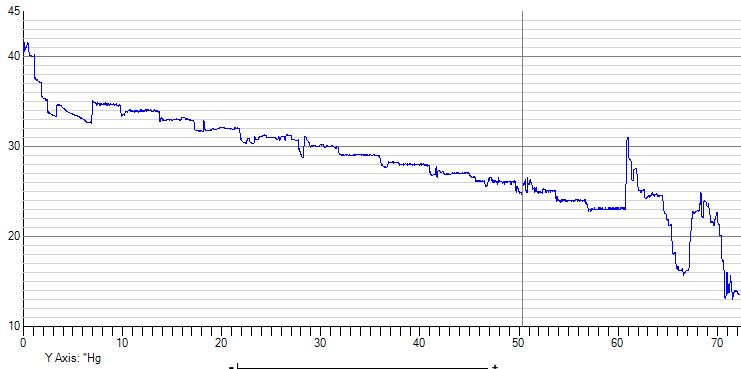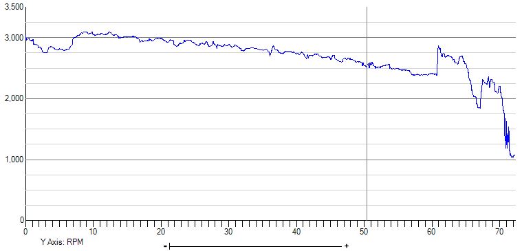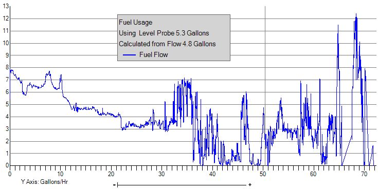 Below are graphs from my last flight, as seen in the Flight Data Viewer. The first is flow, the second is MP and the third is RPM. In this flight test I gradually reduce MP from 35 down to 25 or so to record flow (between 7 & 62ish on the X axis). Note the FF below 5 gph. My fuel system is per the B plans. My cube is between the tank and shutoff valve. No gascolator. Engine is running really good.
