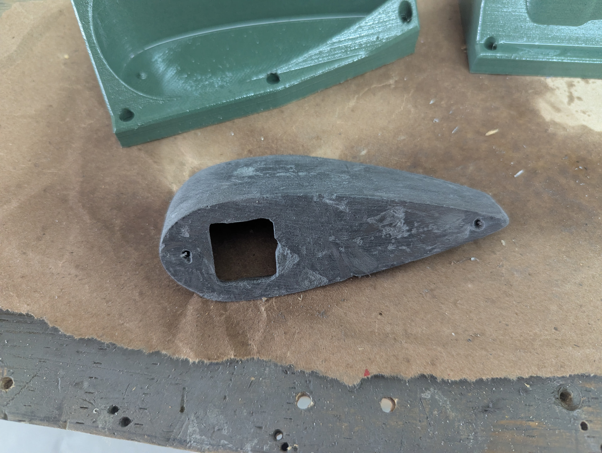 For a first attempt, it came out a little better than I expected. I think I need to use a lot more of the release agent as both halves of the mold were destroyed while releasing the Carbon Fiber part. The green mold halves in the pictures are the ones I’m preparing for the left side. I’ve already coated the surfaces with more release agent than the first one (note the shiny appearance) and I’ll add another coat or two before packing the moulds full of resin and chopped carbon fiber.