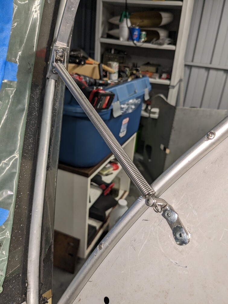 The hatch spring is a good bit shorter than the gas strut, particularly extended, which made the geometry pretty restricted, I’d rather have the canopy a little farther “over center” than it ended up being. They have longer hatch springs with different mounting hardware. I also tried various extension springs from the hardware store, but I did not find a “sweet spot” of a spring that would stay in column, but easily release, and had the length I wanted.