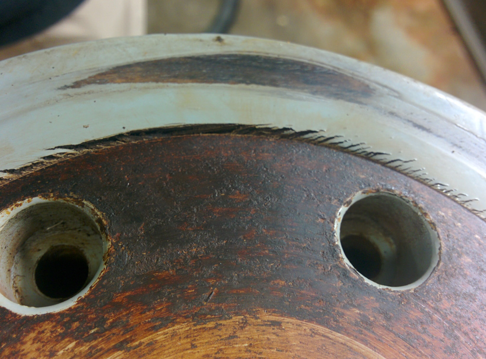 The prop hub is darkened and slightly crushed. I don’t know whether the discoloring is from heat or just the corrosion on the prop flange transferring into the urethane coat of the prop.