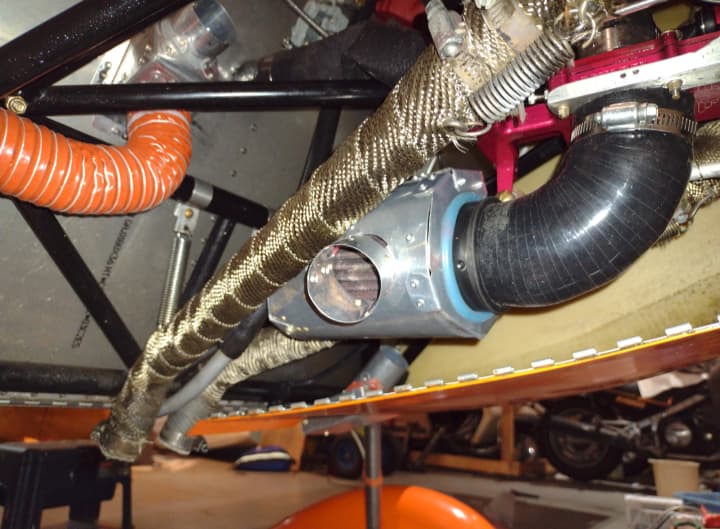 Here you can see my exhaust wrap and if you look close, the fire sleeve over the fuel line: