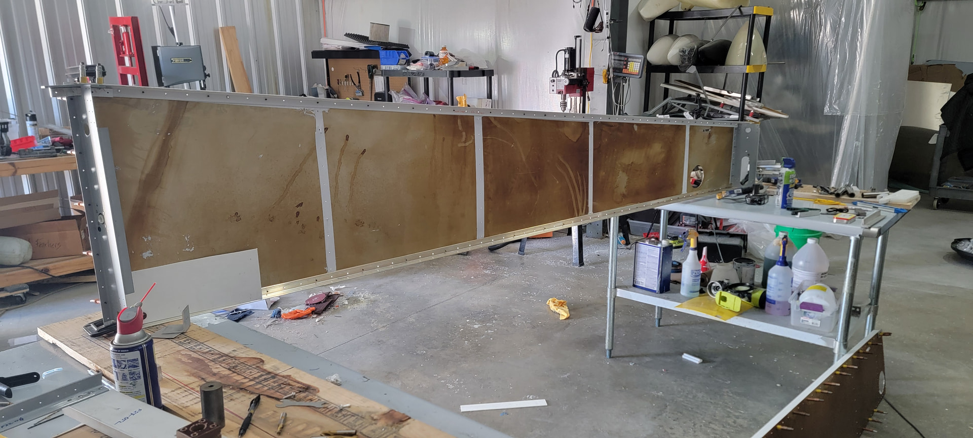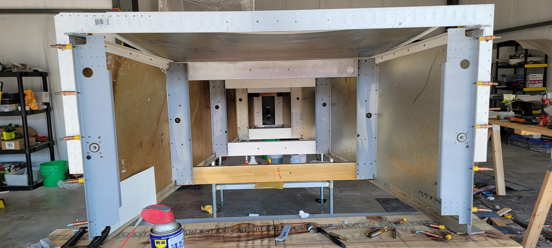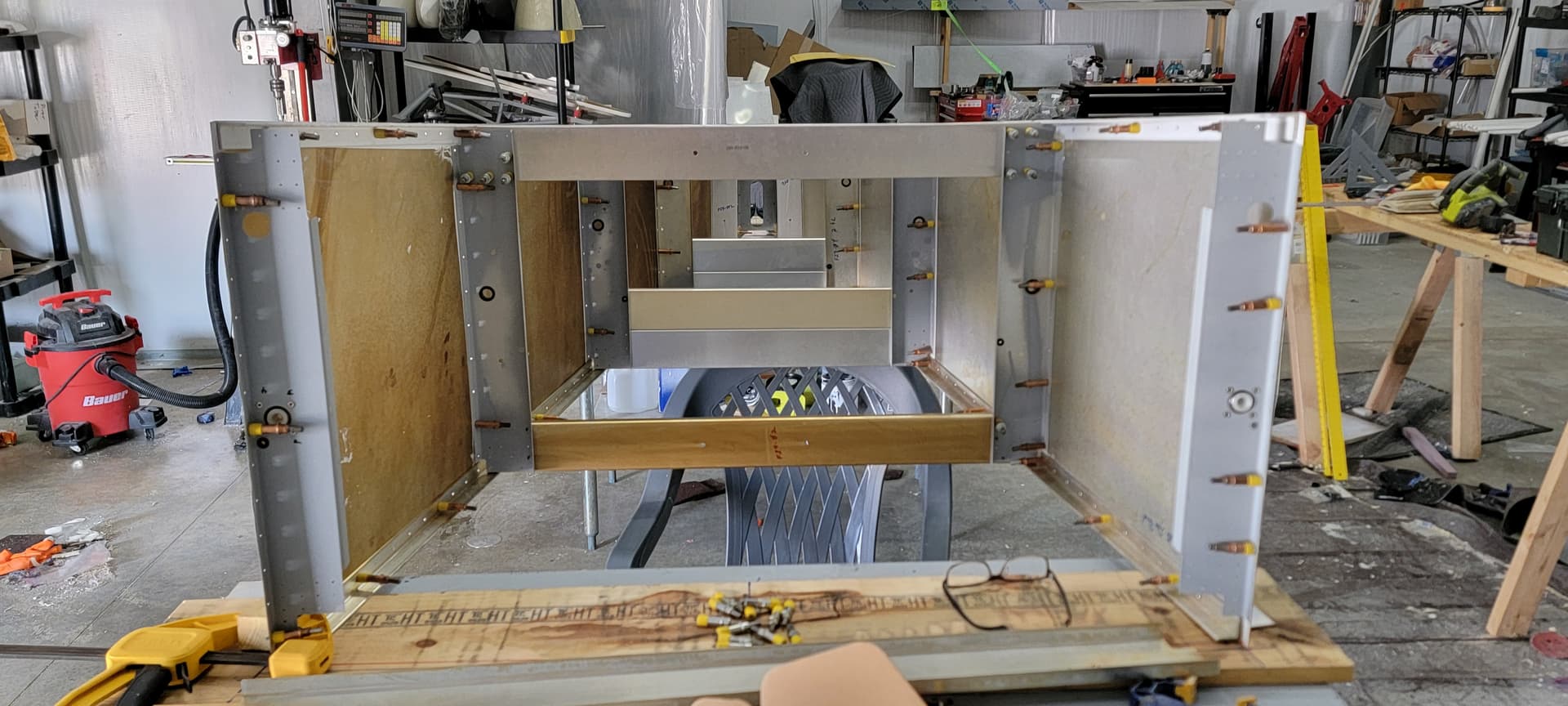 A good day at the hangar. Looking backward and forward. I’m running out of other things to do before assembly. For example, today, I re-organized and re-arranged my workspace and built a jig for the aft fuselage. Then I test mounted the cleco’ed aft fuselage side panels. The reorganization was about relocating the various and assorted tools now living on my work bench. Most went willingly…. The benchtop was removed, the two smaller tables beneath were relocated a couple of feet and were transformed into the aft fuselage jig. The bench top was plopped on top of a couple of sawhorses. It has been demoted to a parts staging area.
