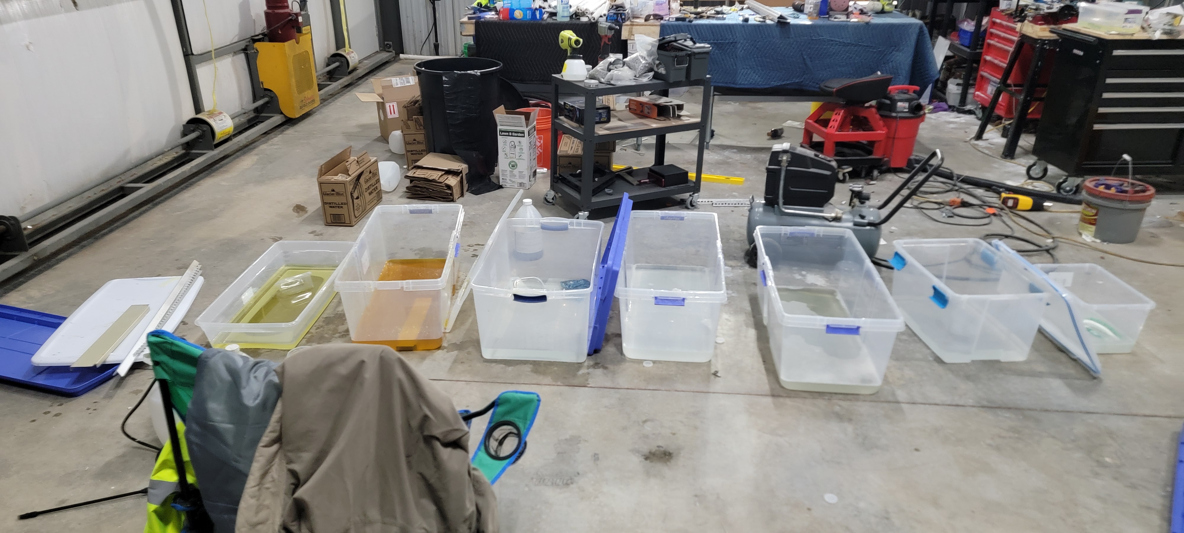 The production line, Right to left, Soapy water for initial wash, Distilled water for rinse, Acid etch bath, distilled H2O & baking soda, Distilled H2O, Alodine bath, Distilled H2O final rinse.