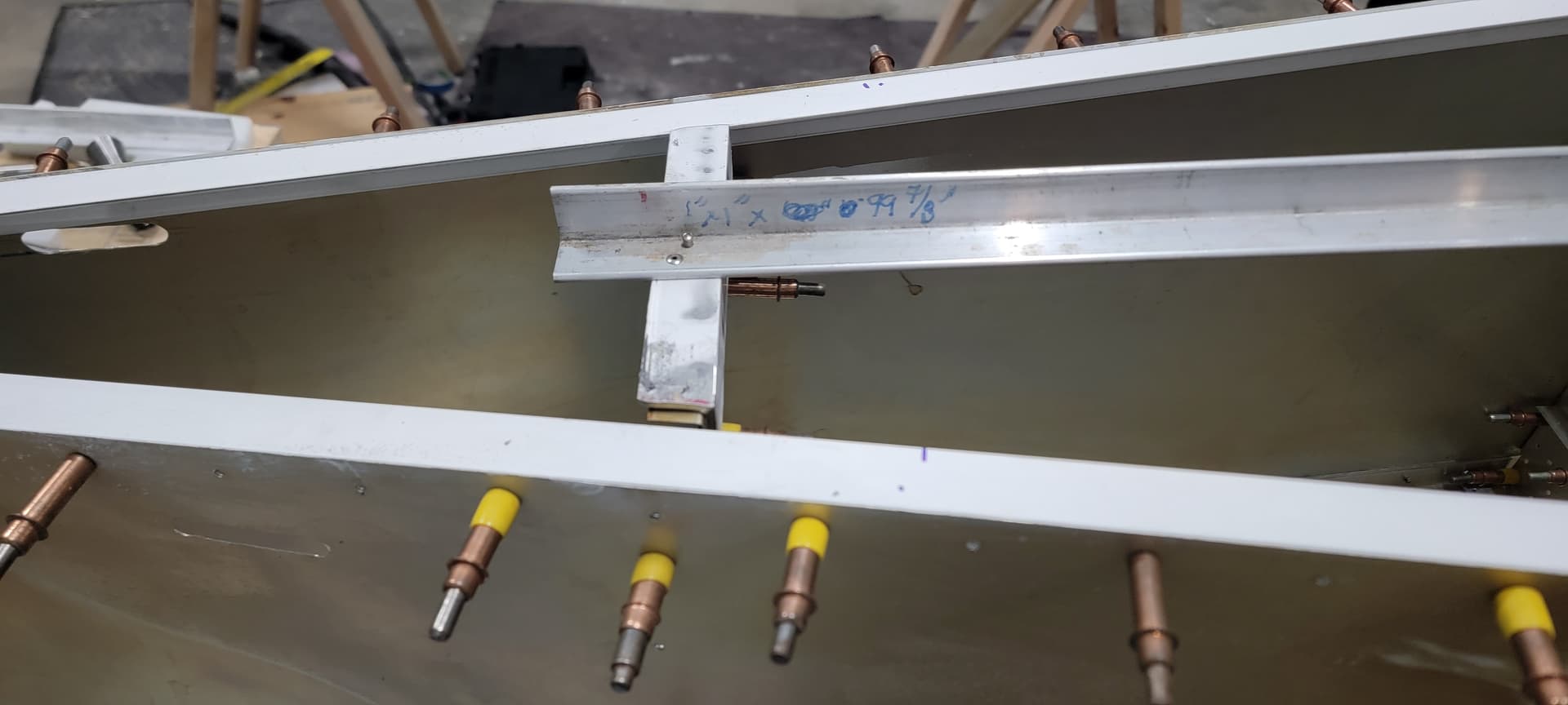 The 2nd and 5th crossties were purchased from Sonex, and have a predrilled hole for the lower skin at the center of the crosstie. Line up the vertical side of the longitudinal angle with the center of that hole and the jig is centered.