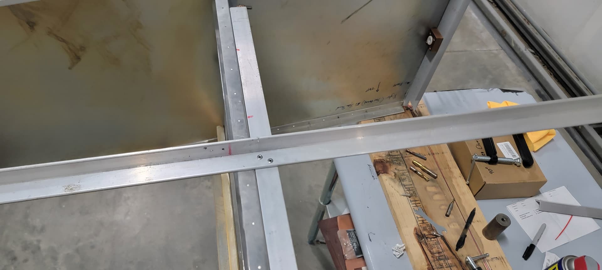I woke up at 3:00 AM the other day, and my mind was working hard. I seem to do this frequently, most often regarding something Sonex related. Such as, forward hinged canopy, 2 options, etc. I usually discard them in the end as being too much extra work, too much extra weight, and little or no additional utility. Saturday’s solution was a jig to insure the aft fuselage is square and true. As a result of a longeron mistake, I have a considerable surplus of 1” angle stock. I tool a long piece of angle, added some crosspieces. I riveted them together, using a piece of tool steel taken from a scraped die as a corner block to insure the angles are square and checked the results with a large machinists square.