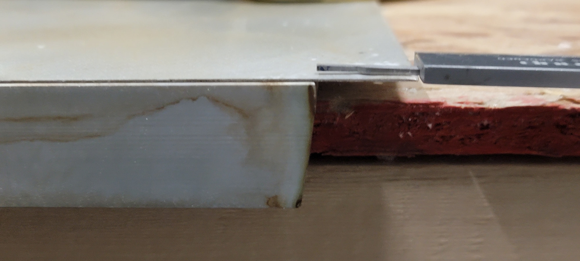 Loaded in the end mill. High quality cut, easy to cleanup. Saw blade in collet.Put the dimensions into a right triangle calculator, discovered that the angle of the kink is 5.124 degrees. My rotary table has about a half a degree in backlash, and lacks the precision for this. I have angle blocks that can be stacked, however, the smallest increment is 1/4 degree. I can get to either 5 Degrees or 5.25 degrees. The difference amounts to 0.005 inches. I can accept that variance. Made a good part, and bent it backward. My scrap pile keeps getting larger and larger.