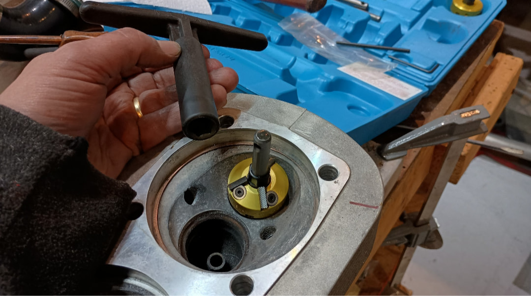 Then the cutter goes on the pilot. It has nifty carbide blades and there is a set for 30, 45, and 60 degrees. The yellow cutter in the picture has 30 on one side, and hidden in the picture is the 45 degree on the other side.