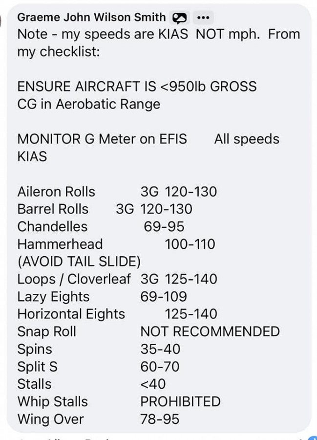 Arjay wrote:Graeme/others: what speeds do you use for aerobatics? I.e. entry and never exceed speeds for loops, rolls, hammerheads, etc?