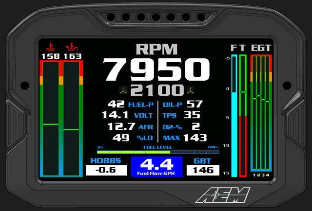 I am running an AEM ECU for my engine. I am working with Bryan Dacus with BD turnkey out of Reno, NV to get this built, programmed, and tuned. There is a panel mounted display that provides my engine information including, RPM, oil temp, oil pressure, water temp, water pressure, EGT on each cylinder, fuel pressure, AFR info, and much more related directly to the engine. One of the cool things about this system is that it can accept a variety of configurable inputs through a can bus module. I am going to integrate the following inputs to the system for display on the panel: