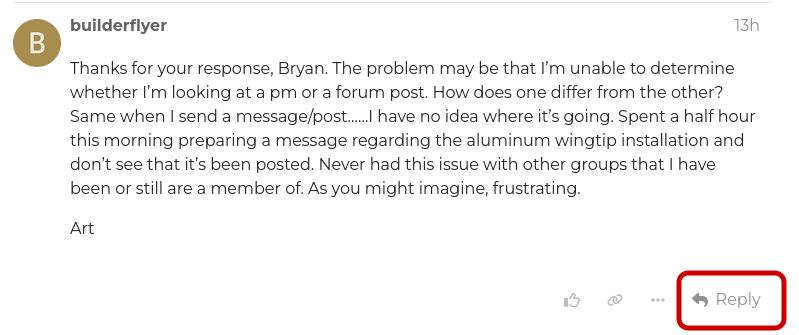Thanks for your response, Bryan. The problem may be that I’m unable to determine whether I’m looking at a pm or a forum post. How does one differ from the other? Same when I send a message/post……I have no idea where it’s going. Spent a half hour this morning preparing a message regarding the aluminum wingtip installation and don’t see that it’s been posted. Never had this issue with other groups that I have been or still are a member of. As you might imagine, frustrating.