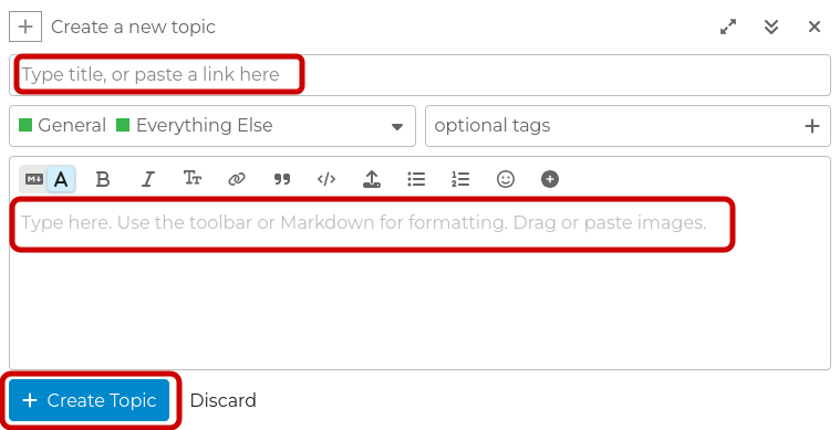 Creating a new post - Pick out a category on the menu on the left hand side, then select the subcategory, then select New Topic (picture below labeled “NewTopicStart” makes this clearer). Then you’ll get a message box with a place to write and a button to post it. See pic NewTopicPost for that example.