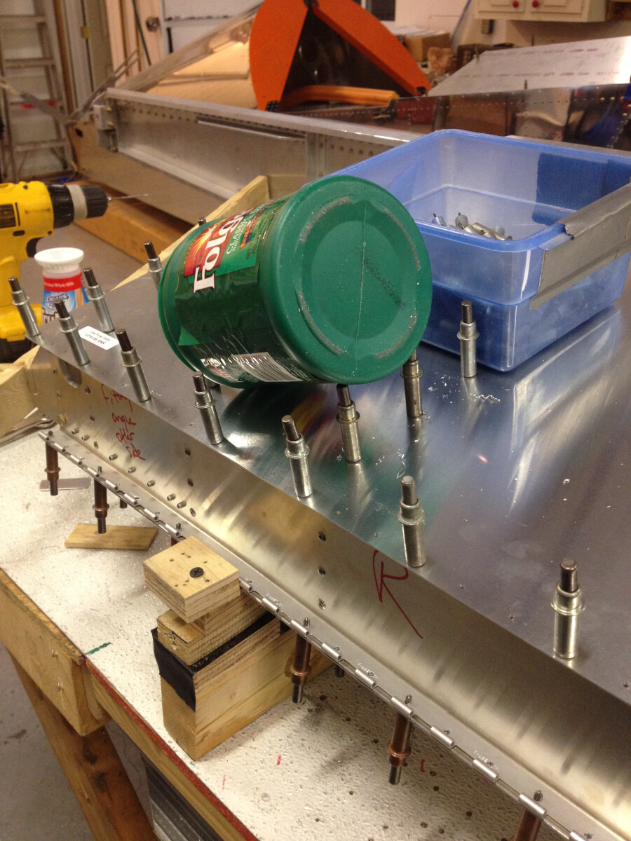 The spars should be blocked up and leveled before you start. Find a way to secure the wing spars to the table and blocks so they won’t move. That’s how you ensure they are true. So you do the aft and leading edge skin, then flip it over. Repeat your leveling, and you will need different blocks. Do the other aft skin and then do the ratchet straps for the leading edge.