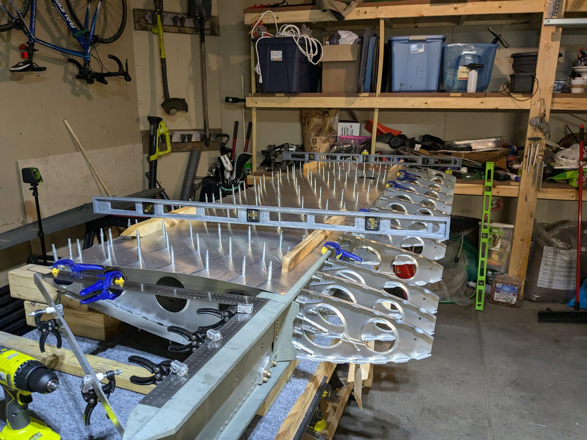 I spent some time in the hangar today looking at this and thinking about what might go wrong if I attempted to do it vertically. I settled on doing it horizontally as the factory shows and you all recommended. Spent some time verifying that my platform itself was level, and tops of spars were level after blocking/shimming, and clamped in place. Skin back in place and clecoed at the TE, and verified level again. Drilled and clecoed the top aft skin up to but not including drilling into the main spar (that is tomorrow’s job, plus flipping it over to put the bottom aft skin on). Everything lined up fairly well with only slight tweaks needed in a few spots.